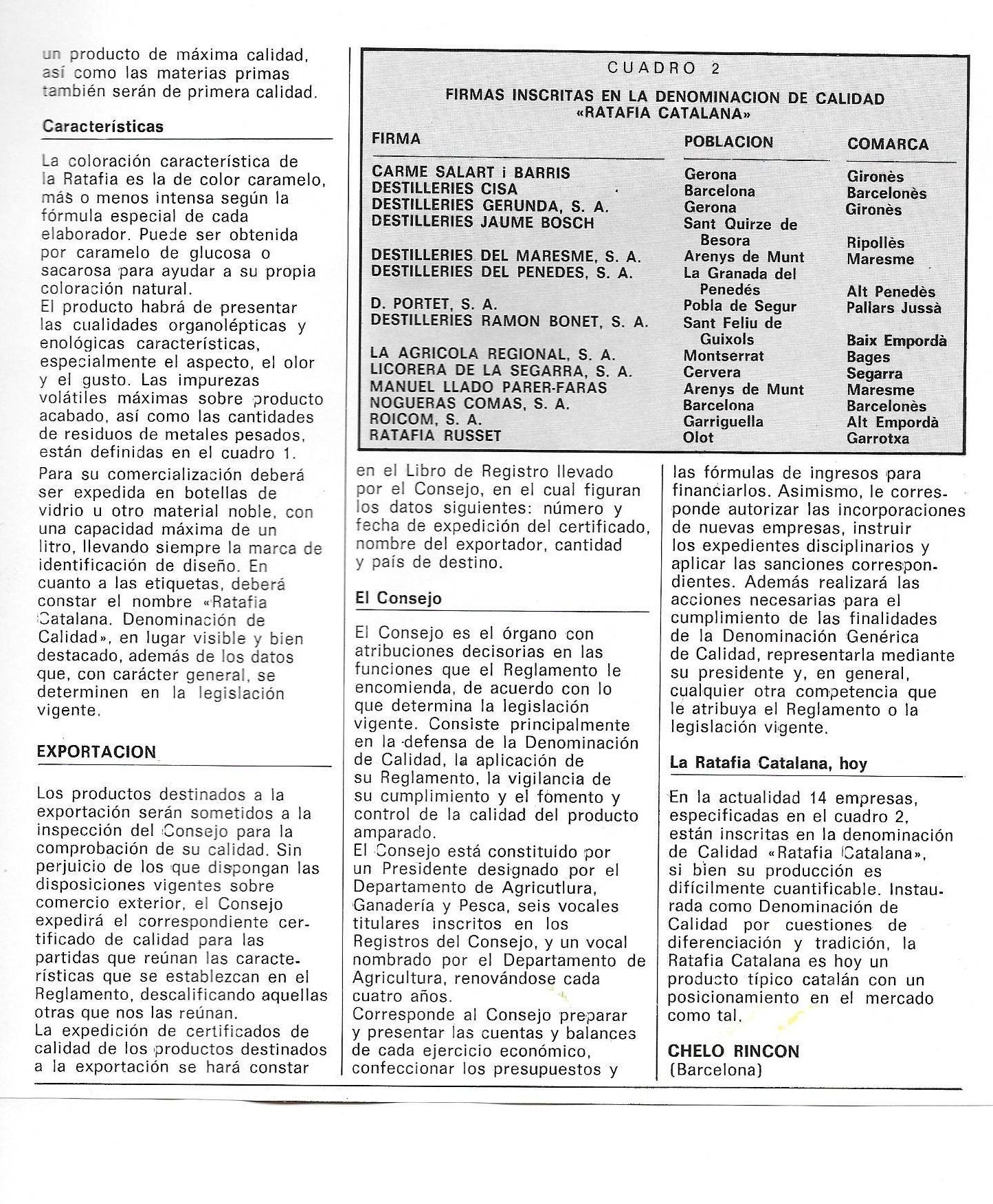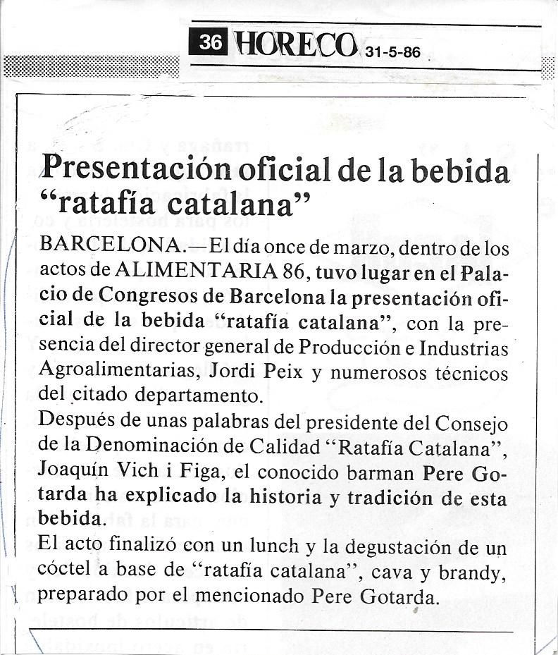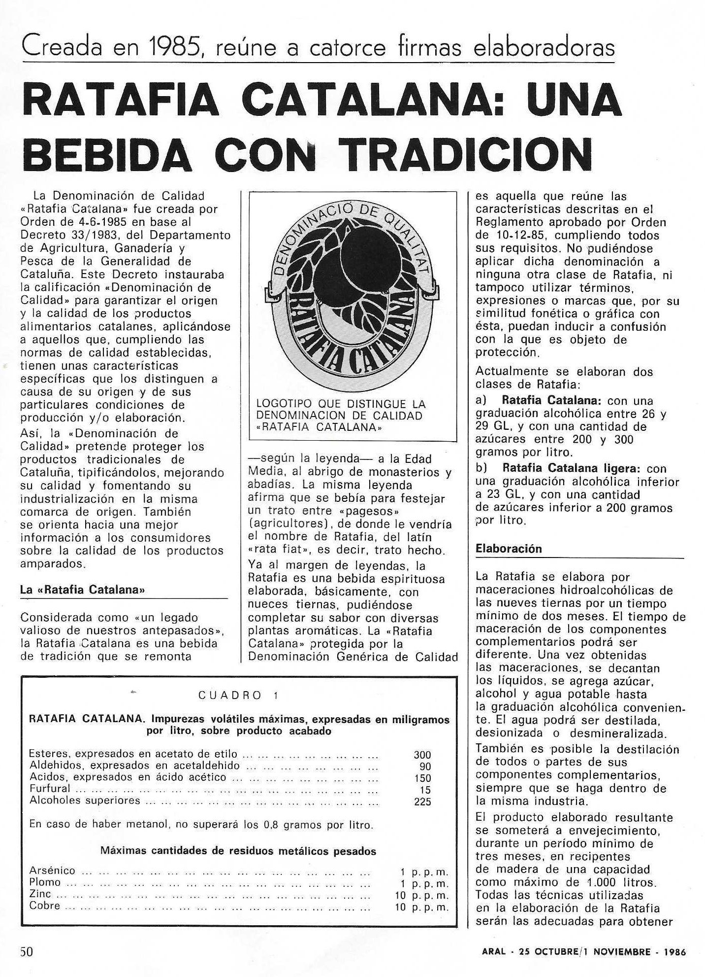 Una prova inqüestionable de la importància a Catalunya és el reconeixement a la Ratafia Catalana com a Denominació de Qualitat l‘any 1985 (DOGC núm. 563, de 17 de juliol de 1985), adaptada a Denominació Geogràfica l‘any 1998 (DOGC núm. 2650, de 29 de maig de 1998) i ratificada pel Ministerio de Agricultura Pesca y Alimentación (BOE núm. 256, de 26 d‘octubre de 1998).